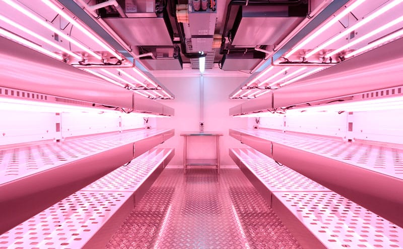 The plant tissue culture room comprises two identical, but independently-controlled sections, separated by an airlock. Sitting at over 12 metres in length, the steel structure contains insulated panelling, lifting points and forklift slots for portability, and a rigid base with no requirement for footings.